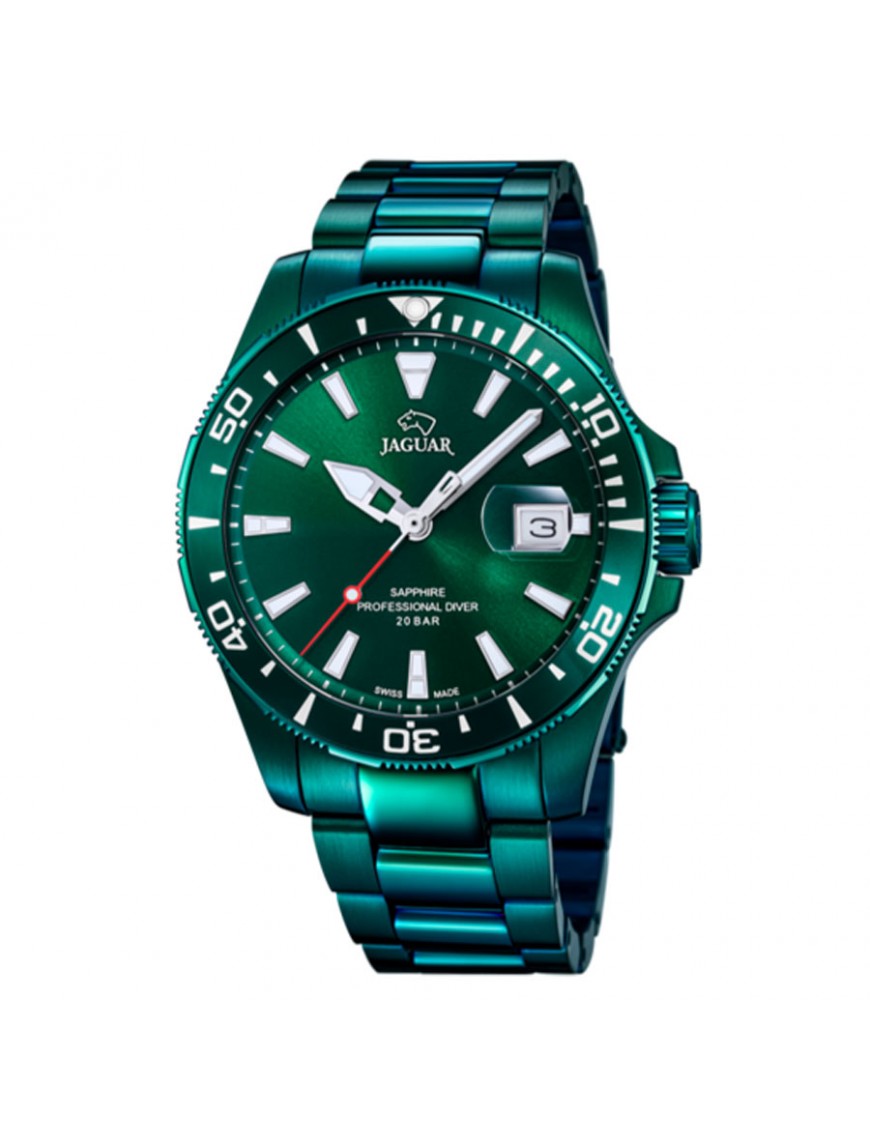 Reloj Jaguar para hombre J988/1. La esfera es de acero y mide 44 mm de diámetro. La pulsera es del mismo material con cierre desplegable. Incluye calendario y cristal zafiro que no se raya. Es sumergible a 20 ATM por lo que permite el buceo con botella. Garantía de tres años.