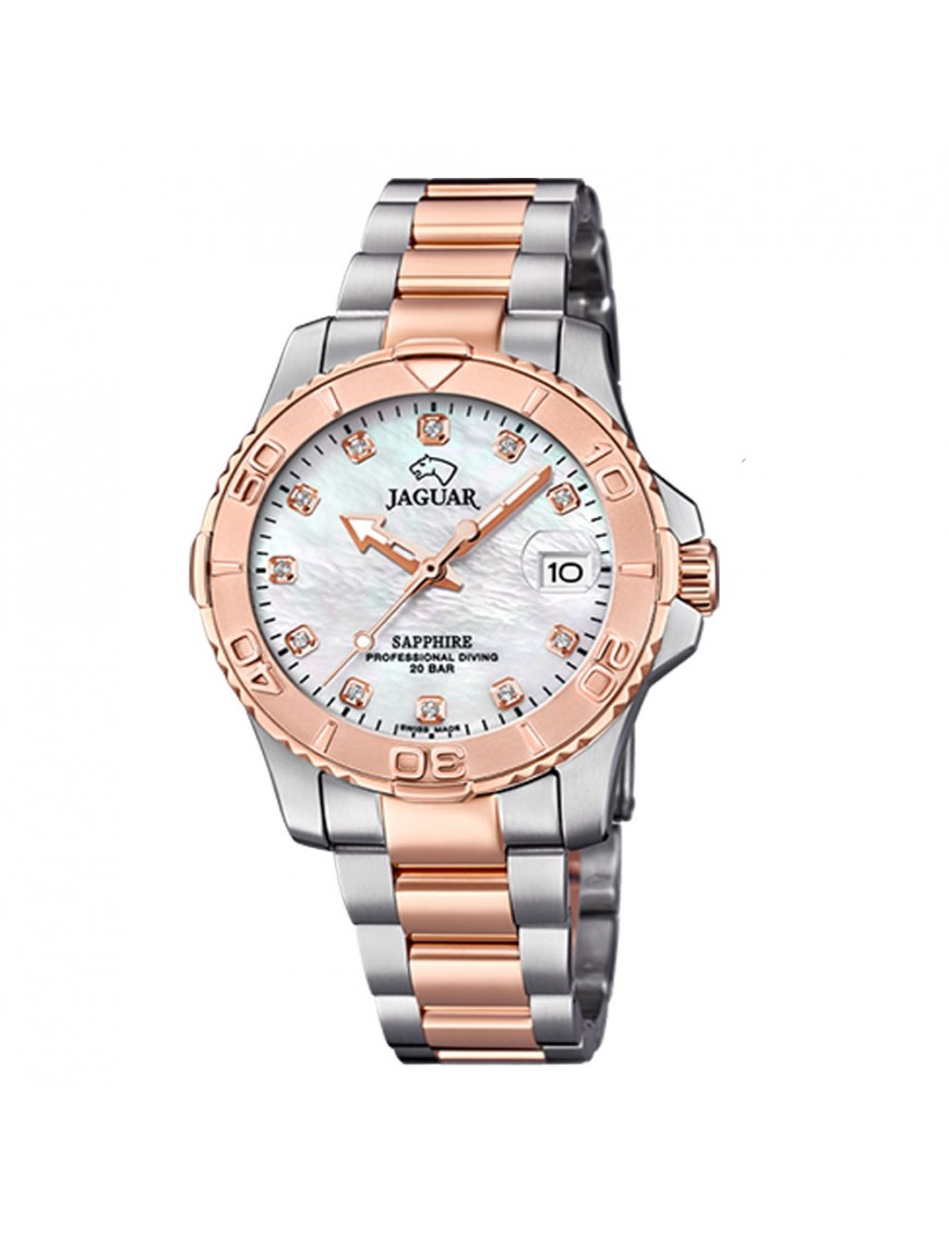 Reloj Jaguar Mujer J871/5, analógico de tres agujas Swiss Made. Caja de acero de 34mm de diámetro. Esfera de nácar decorada con circonitas. Bisel en color rosé- Pulsera de acero bicolor- Cristal de zafiro. Ventana de calendario. Sumergible a 20ATM, por lo que es apto para inmersión.