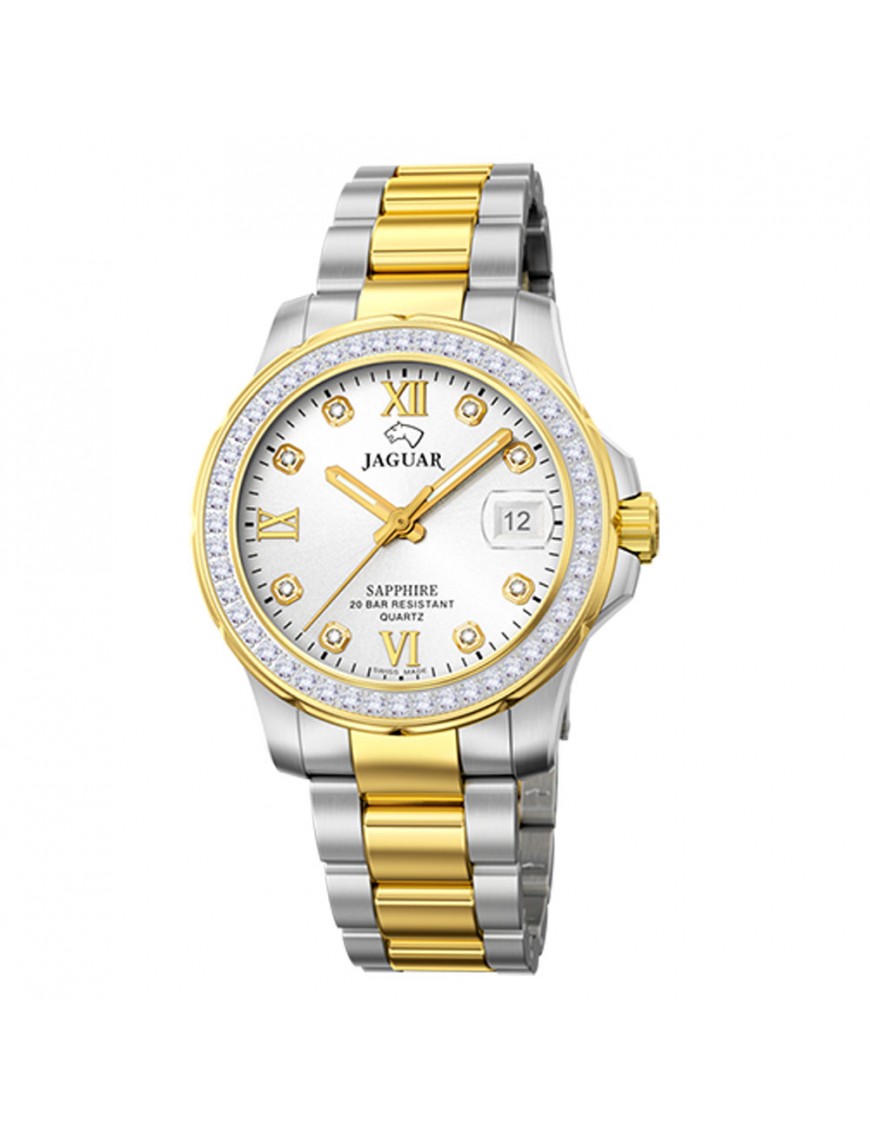 Reloj Jaguar Mujer J893/1, analógico de tres agujas Swiss Made. Caja de acero de 34.5mm de diámetro. Bisel en color dorado decorado con circonitas. Pulsera bicolor de acero. Cristal de zafiro. Ventana de calendario. Sumergible a 20ATM, por lo que es apto para inmersión.