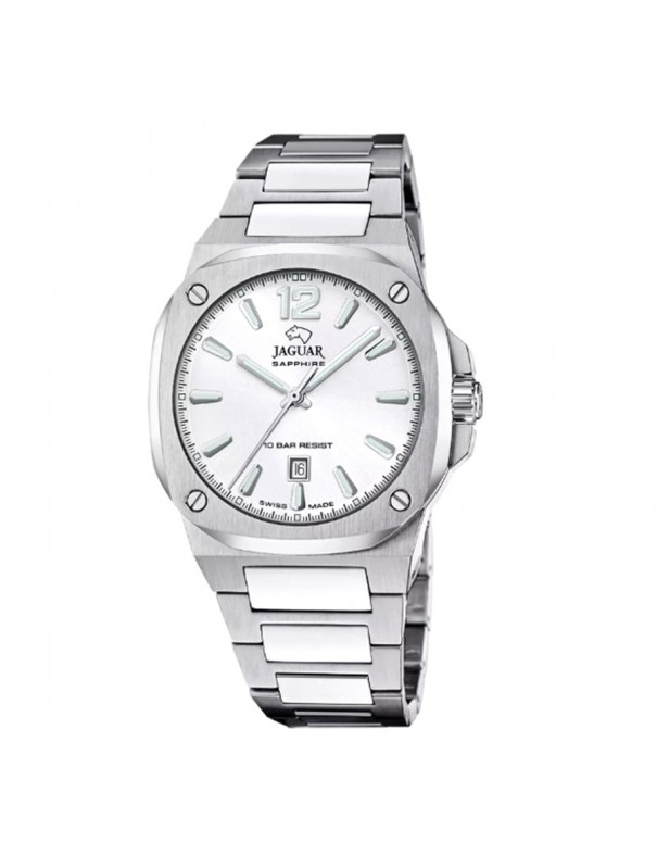 Reloj Jaguar Swiss Made Plateado J1024/4. Reloj masculino con caja de acero inoxidable en color plateado y esfera clara protegido por cristal de zafiro resistente a arañazos. Brazalete de acero plateado con cierre desplegable de tipo mariposa con seguridad. Movimiento de cuarzo suizo Ronda 705 con indicación de fecha. Diseño elegante de estilo clásico-moderno, apropiado para uso diario y formal.