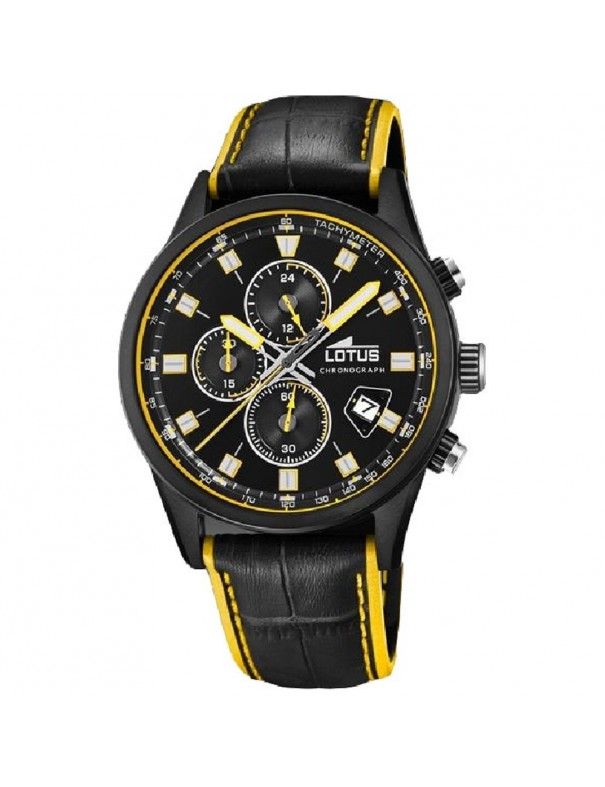 Reloj Lotus Hombre Multifunción 18589/1. Colección Lotus Color. Es un reloj analógico, con maquinaria de cuarzo con índices y agujas en color amarillo luminiscentes como las agujas. Cronógrafo. Alimentación a pilas. La esfera en color negra y la correa en piel auténtica de color negra con detalles en amarillo. La resistencia al agua es de 50 metros (5 ATM). Tipo de cierre hebilla