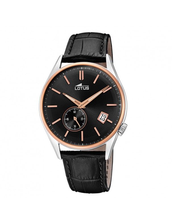 Reloj Lotus Hombre 18356/3, analógico con segundero independiente. Agujas e indicadores en color cobrizo. Ventana de calendario. Bisel cobrizo. Cristal mineral. Pulsera de piel negra. Sumergible a 3ATM, por lo que sólo soporta pequeñas salpicaduras.