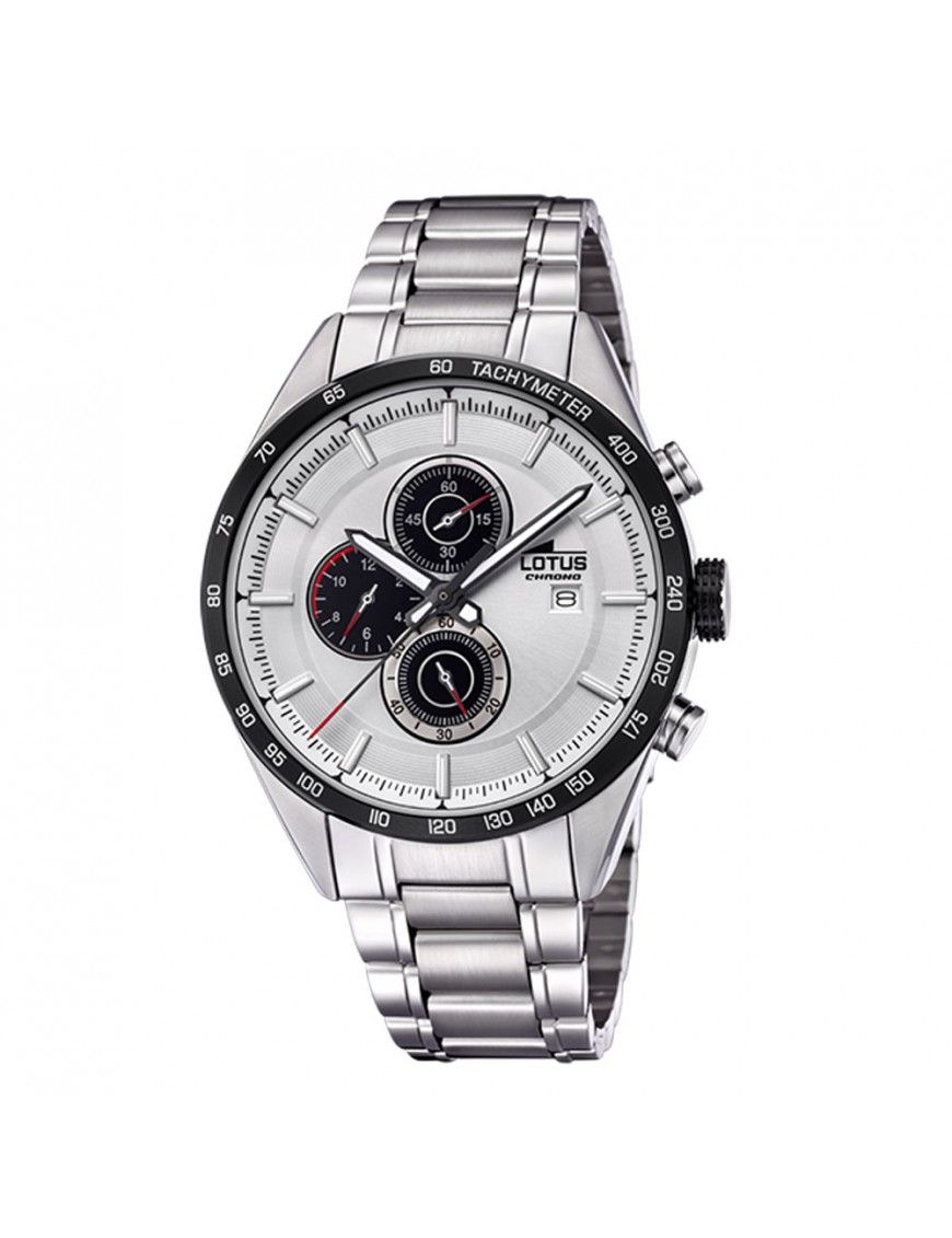Reloj Lotus Crono Hombre 18369/1, cronógrafo analógico. Esfera de 43mm con tres mini esferas. Pulsera de acero. Bisel negro con taquímetro. Cristal mineral. Corona en color negro. Sumergible a 10ATM, por lo que es apto para ducha y baño sin inmersión.