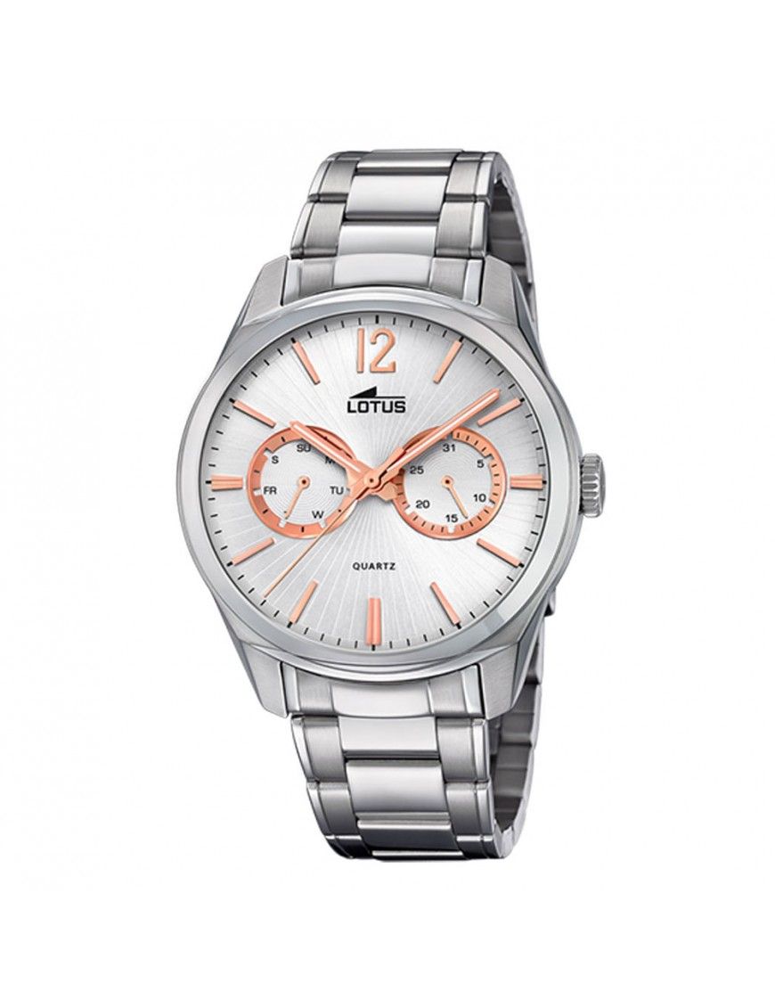 Reloj Lotus Hombre 18373/1, analógico con esfera de 40mm de diámetro con dos mini esferas, que indican el día del mes y de la semana. Agujas e indicadores color cobrizo. Pulsera de acero. Cristal mineral. Sumergible a 5ATM, por lo que es apto para ducha y baño sin inmersión.