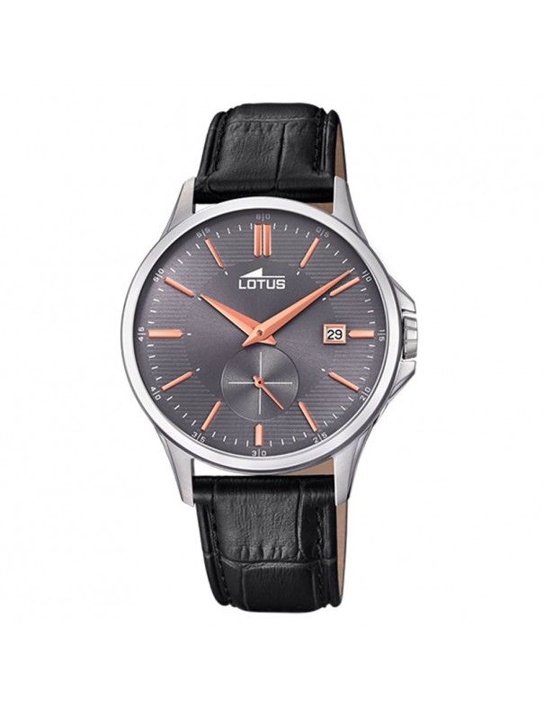 Reloj Lotus Hombre 18424/3, analógico con segundero independiente. Esfera de 40mm de diámetro, agujas e indicadores en color cobrizo. Ventana de calendario. Pulsera de piel y cristal mineral. Sumergible a 5ATM, por lo que es apto para ducha y baño sin inmersión.
