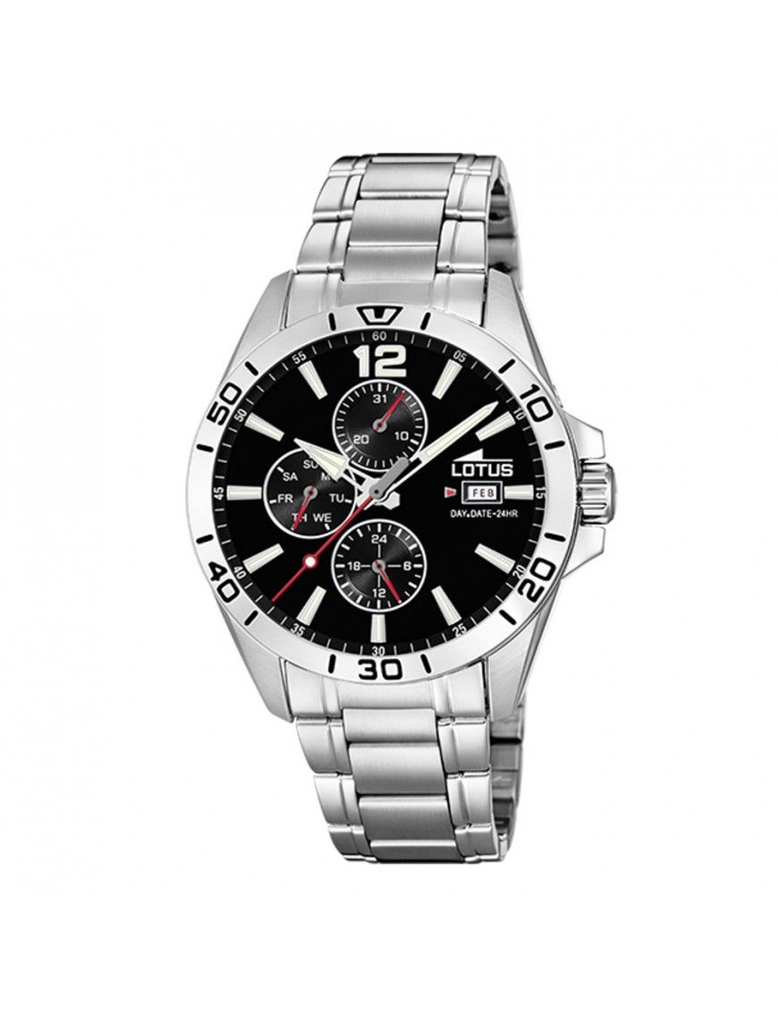 Reloj Lotus Hombre 18666/3, analógico con esfera de 42mm de diámetro, agujas e indicadores luminiscentes. Esfera con 3 mini esferas, indicando día del mes, de la semana y formato de 24 horas. Ventana de calendario. Pulsera de acero. Cristal mineral. Sumergible a 5ATM, por lo que es apto para ducha y baño sin inmersión.
