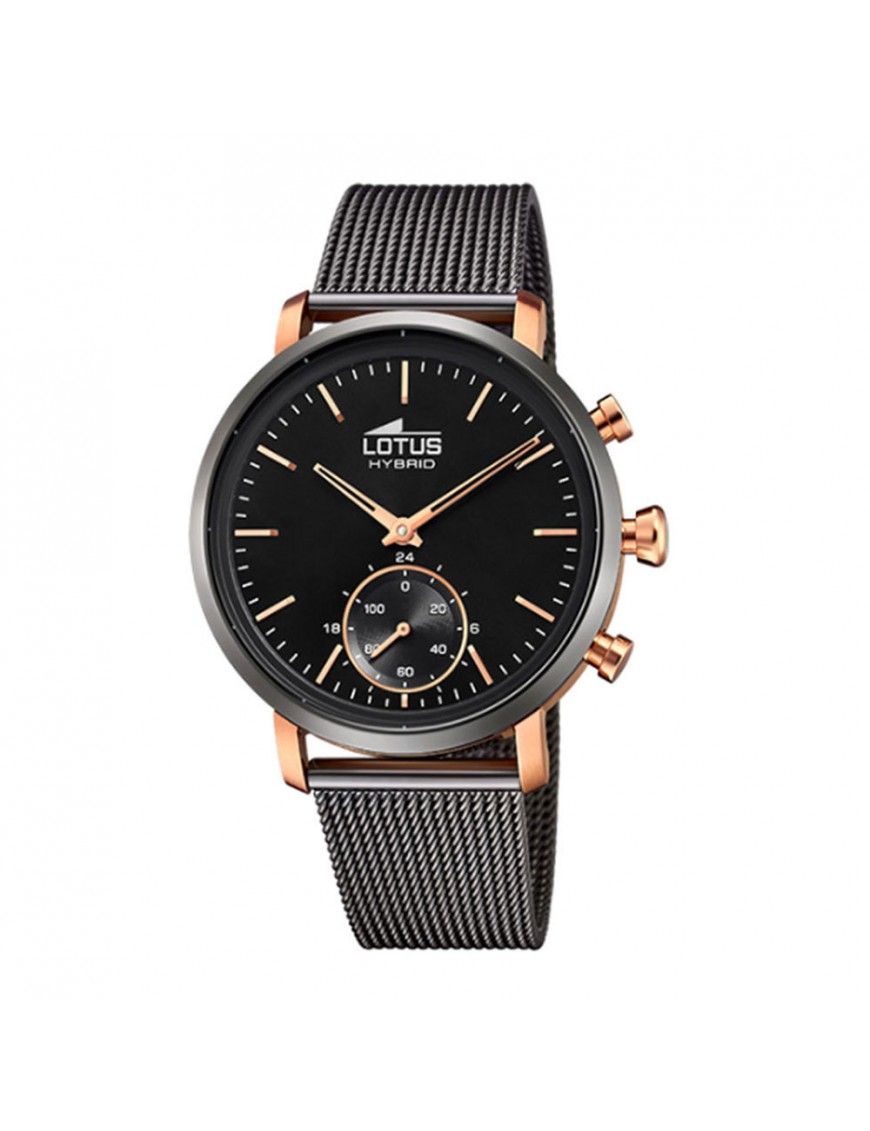 Reloj Lotus Hybrid Hombre 18805/3, analógico y Smartwatch. Esfera de 43mm de diámetro. Pulsera milanesa de acero color negro, caja en cobrizo. Cristal mineral. Se conecta con el dispositivo móvil a través de conexión Bluetooth, accediendo a las funciones de Smartwatch, tales como Cronómetro, Temporizador, Zona horaria adicional, Control remoto de cámara, Control de música, Notificaciones de llamadas, Posibilidad de rechazar llamadas, IFTTT, Acompáñame a casa (siéntete seguro las 24 horas, enviando una señal a alguien y podrá seguir tus pasos)... Sumergible a 10ATM, por lo que es apto para ducha o baño sin inmersión.