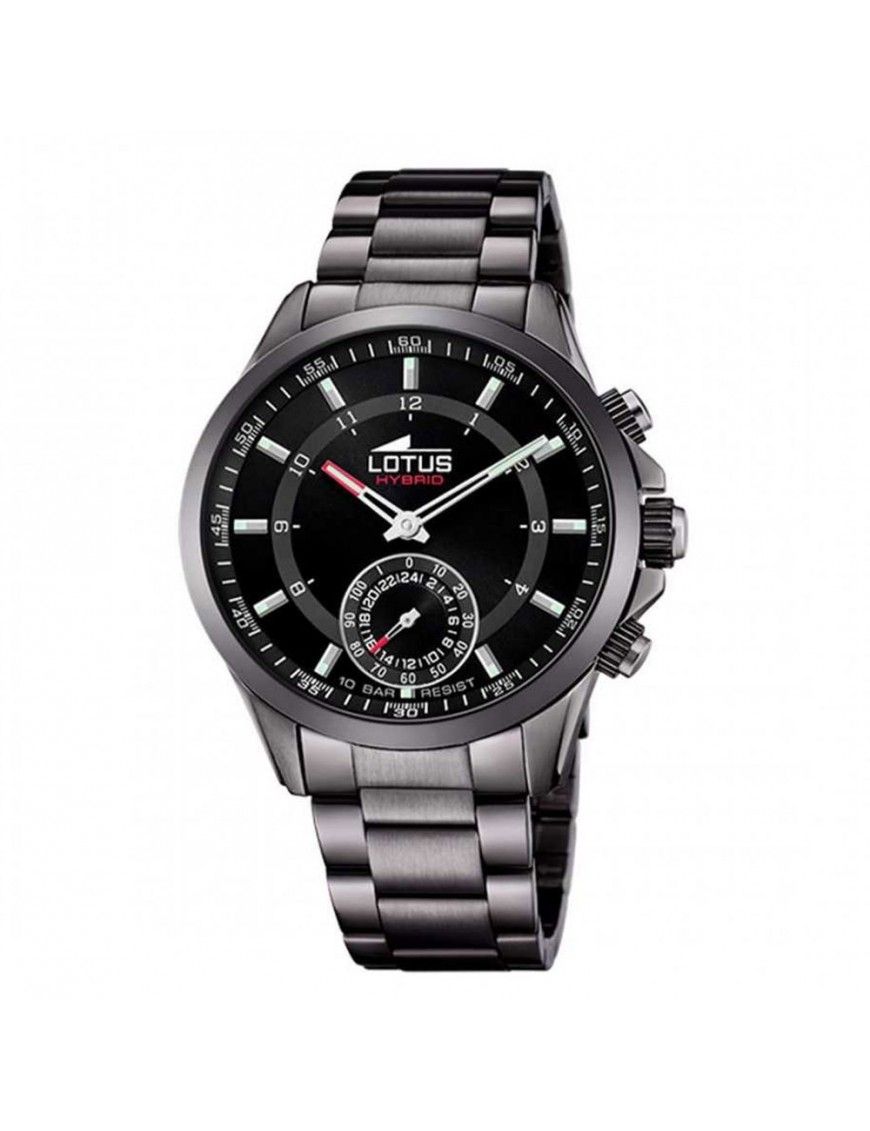 Reloj Lotus Hybrid 18807/2, analógico y Smartwatch. Esfera de 43mm de diámetro, agujas e indicadores luminiscentes. Pulsera de acero en color negro. Cristal mineral. Se conecta con el dispositivo móvil a través de conexión Bluetooth, accediendo a las funciones de Smartwatch, tales como Cronómetro, Temporizador, Zona horaria adicional, Control remoto de cámara, Control de música, Notificaciones de llamadas, Posibilidad de rechazar llamadas, IFTTT, Acompáñame a casa (siéntete seguro las 24 horas, enviando una señal a alguien y podrá seguir tus pasos)... Sumergible a 10ATM, por lo que es apto para ducha o baño sin inmersión.