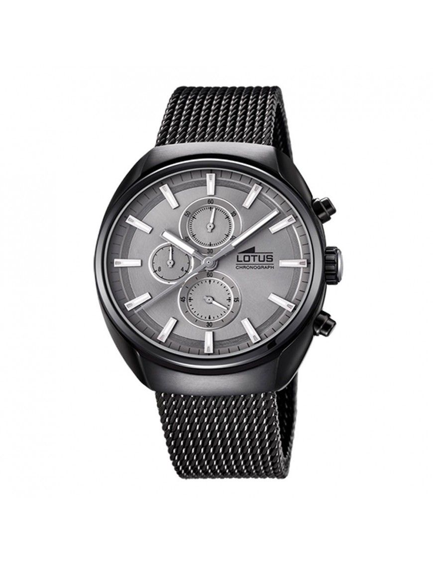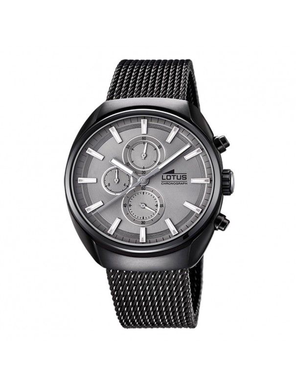 Reloj Lotus Hombre Cronógrafo 18567/C, analógico. Caja de 41mm de diámetro. Pulsera milanesa de acero color negro. Agujas e indicadores luminiscentes. Cristal mineral. Sumergible a 5ATM, por lo que es apto para ducha y baño sin inmersión.