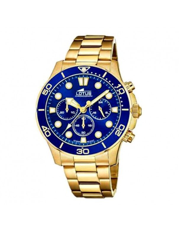 Reloj Lotus Crono Hombre 18758/1, analógico. Esfera de 44mm de diámetro con agujas e indicadores luminiscentes. Bisel azul. Pulsera de acero en color dorado. Cristal mineral.