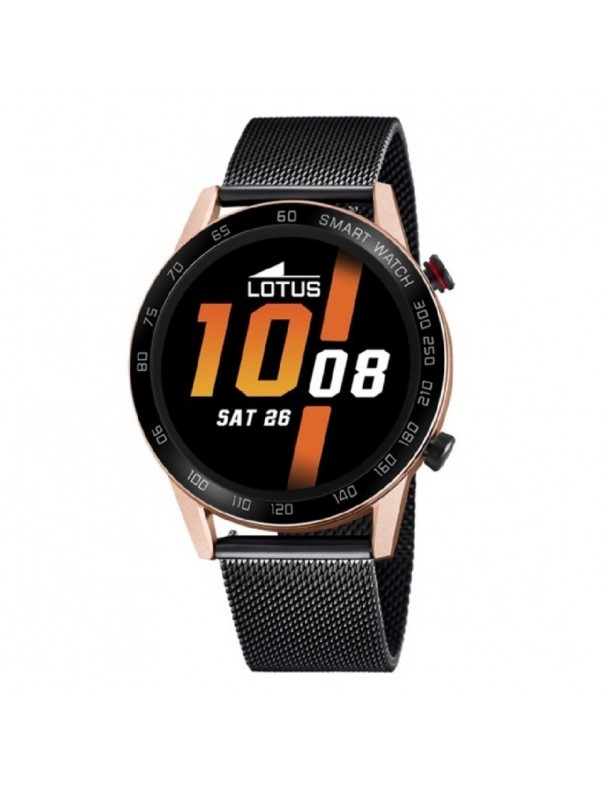 Smartwatch Lotus 50025/1. Caja de 45mm de diámetro. Caja de aleación de zinc. Pulsera de acero y una segunda de caucho negro. Control de pasos, calorías consumidas, presión arterial, frecuencia cardíaca, recordatoria de hidratación y sedentarismo, seguimiento de actividad, presión arterial, monitorización del sueño, control remoto de música y cámara, notificación de llamadas, mensajes y redes sociales. IP67.