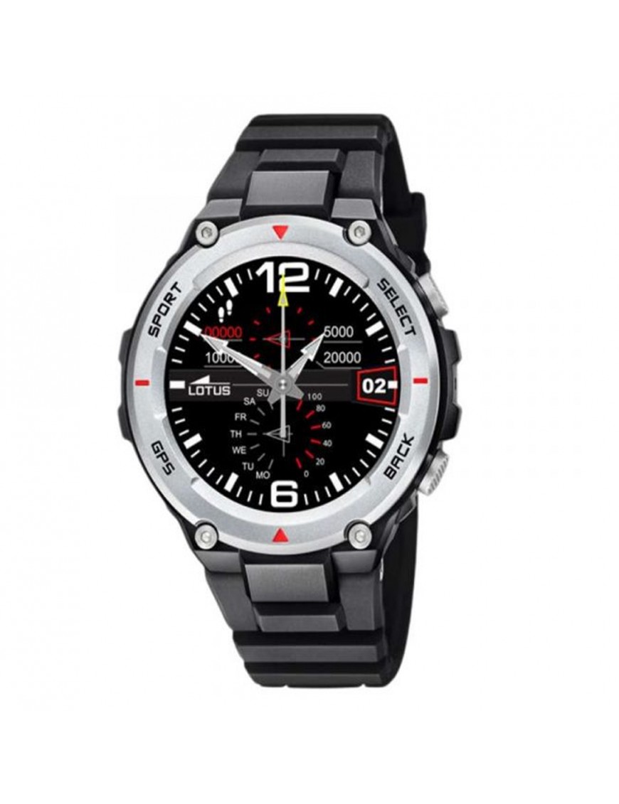 Smartwatch Lotus 50024/4. Caja de 50mm de diámetro. Pulsera de caucho. Función de alarma, calendario, cronógrafo, cuenta pasos, encuentra el teléfono, indicador de carga, llamadas desde smartwatch, monitorización del sueño, notificaciones, recordatorios, sensor de acelerómetro, presión atmosférica, altímetro, GPS...IP67.