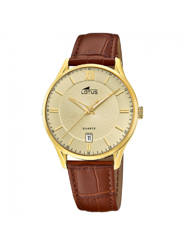 Reloj Lotus para hombre 18403/G. La esfera es de acero y mide 39 mm de diámetro. La pulsera es de piel con hebilla. Incluye calendario. Es sumergible a 5 ATM y permite el nado en superficie sin inmersión (no recomendable para la pulsera de piel). Garantía de tres años.