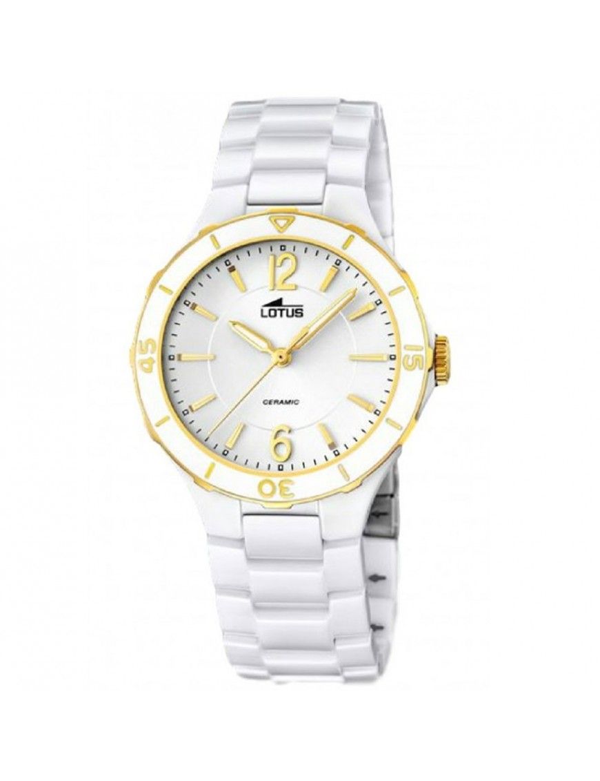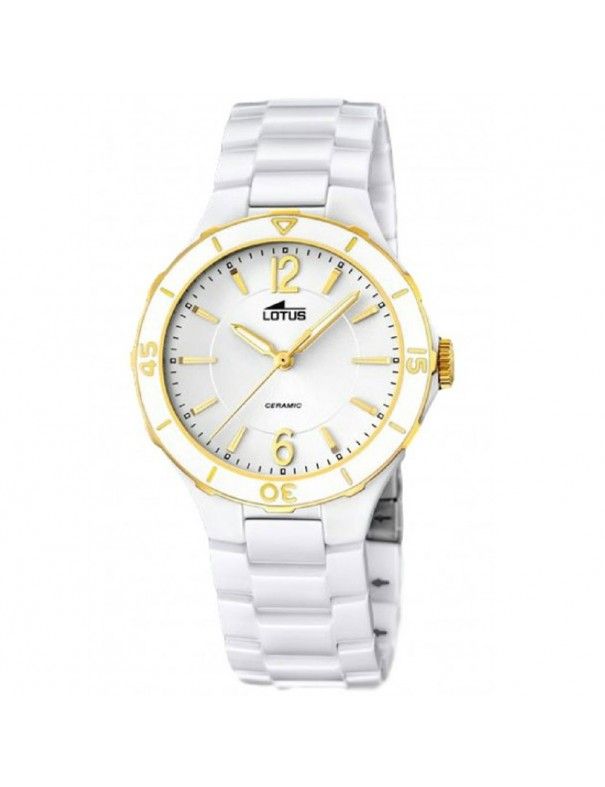 Reloj Lotus para mujer Ceramic 15935/1. Es un reloj analógico tres agujas, con movimiento de cuarzo. Un cristal mineral cubre la esfera la cual es blanca, los indicadores horarios son índices combinados con números romanos en color oro. El elegante brazalete está realizado en cerámica blanca.