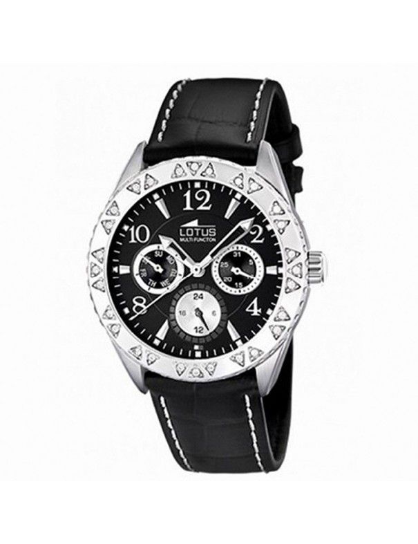 Reloj Lotus multifunción mujer 15681/3. Es un reloj analógico, multifunción. Tiene la esfera de color negro y la caja de acero inoxidable de 40 milímetros de diámetro. La correa en piel negra. Tiene movimiento de cuarzo y cristal mineral.