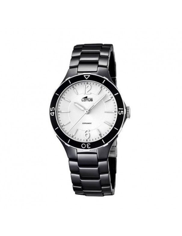 Reloj Lotus Mujer 15931/3. Es un reloj analógico de tres agujas, diseñado y elaborado por la firma Lotus, para mujer, y pertenece a la línea Cool. La caja que contiene el mecanismo de cuarzo, alimentado con pila, está fabricada en acero hipoalergénico, tiene un diámetro de 34.5 milímetros y es sumergible a 50 metros de profundidad. Sobre ella descansa el bisel liso. La correa es de cerámica color negra. Los indicadores de la hora son índices y números arábigos y las agujas son plateadas y luminiscentes. Este reloj Lotus para mujer incluye una garantía de 2 años y se envía con envoltorio especial para regalo, obsequio de Marjoya.