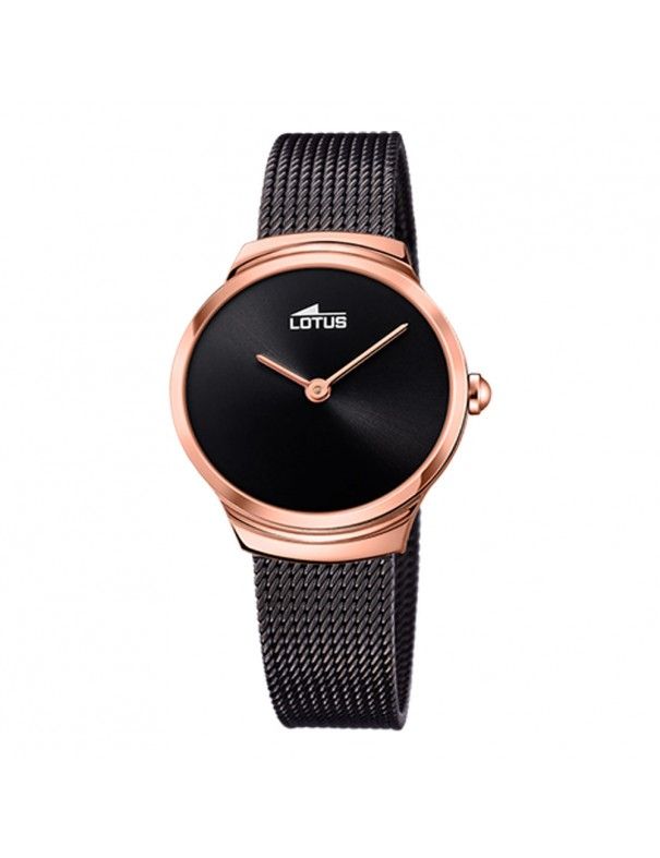 Reloj Lotus Mujer 18496/3, analógico, esfera de 24mm de diámetro sin segundero. Caja y agujas en color cobrizo. Pulsera milanesa de acero en color negro. Cristal mineral. Sumergible a 5ATM, por lo que es apto para ducha y baño sin inmersión.
