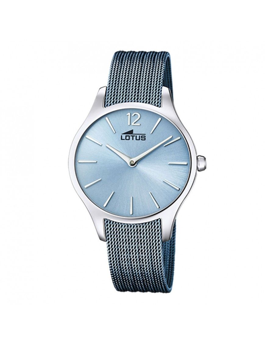 Reloj Lotus Mujer 18749/2, analógico sin segundero. Esfera azul de 32mm de diámetro, correa de acero milanesa. Cristal mineral. Sumergible a 5ATM, por lo que es apto para ducha y baño sin inmersión.