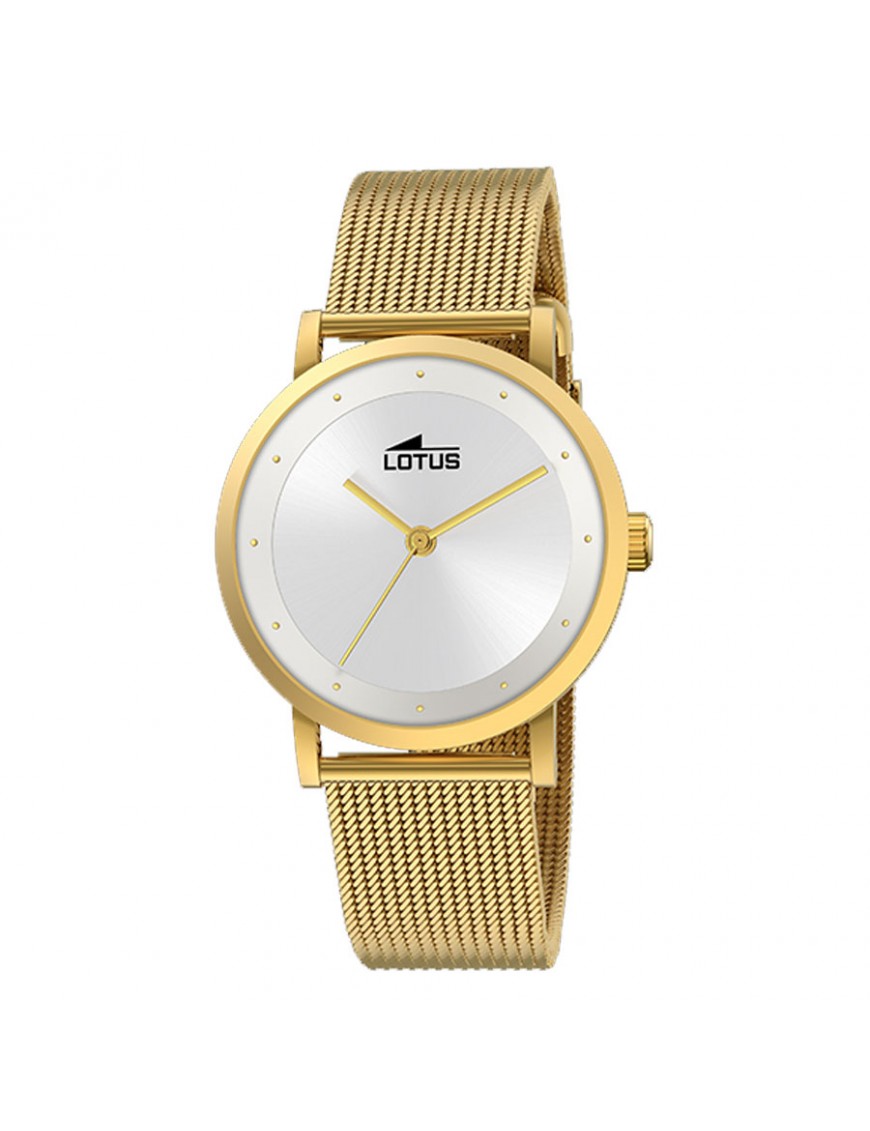 Reloj Lotus para mujer 18791/1. La esfera es de acero dorado y mide 35 mm de diámetro. La pulsera es del mismo material y lleva cierre de presión. Es sumergible a 5 ATM por lo que permite el nado en superficie sin inmersión. Garantía de tres años.