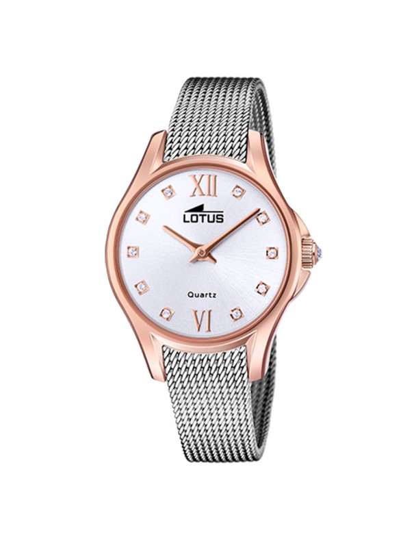 Reloj Lotus para mujer 18824/1. La esfera es de acero y mide 33 mm de diámetro. La pulsera de malla es del mismo material y lleva cierre de presión. Es sumergible a 5 ATM por lo que permite el nado en superficie sin inmersión. Garantía de tres años.