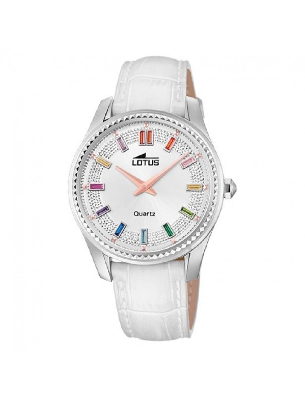 Reloj Lotus para mujer 18899/1. La esfera es de acero y mide 38 mm de diámetro. La pulsera es de piel con hebilla. Es sumergible a 5 ATM y permite el nado en superficie sin inmersión (no recomendable para la pulsera de piel). Garantía de tres años.