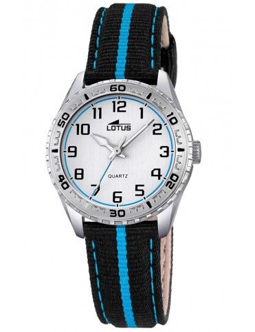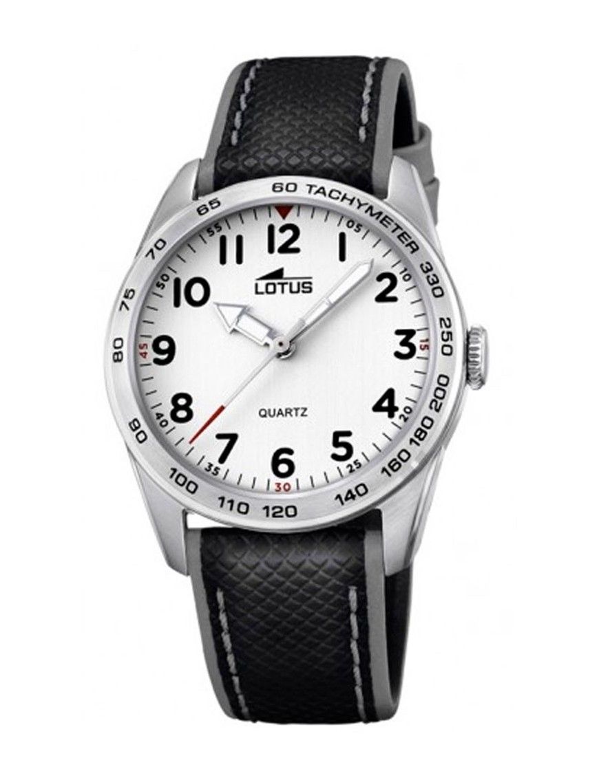Reloj Lotus Niño 18276/1. Se trata de un reloj analógico de 3 agujas pensado para niños por la firma Lotus. La esfera del reloj es blanca, tiene dibujos los marcadores de las horas y está cuidada por un cristal mineral. La correa es de color negra fabricada en piel, está decorada por despuntes blancos y franjas grises, además, su cierre es de hebilla. La caja que encierra al mecanismo es de acero hipoalergénico, mide 33,50mm y es sumergible a 50 metros. El bisel del reloj es gris y está decorado con indicaciones. Este producto de Lotus cuenta con una garantía de 2 años.