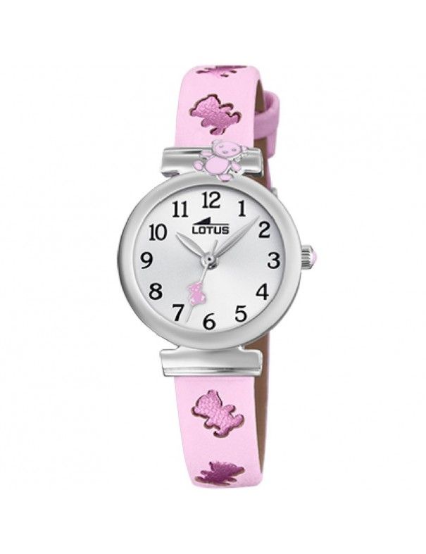 Reloj Lotus Niña comunión 18628/2. Es un reloj analógico de 3 agujas pensado para niñas por Lotus. La esfera del reloj es color blanca, tiene marcadores horarios en forma de números arábigos y está protegida por un cristal de mineral. La caja que contiene el mecanismo es de acero hipoalergénico, tiene un diámetro de 25 milímetros y es sumergible a 50 metros. El bisel del reloj es de color plata liso con detalle de un osito al igual que la aguja del segundero en color rosa. La pulsera está fabricada en piel de color rosa con detalle de osos en purpurina brillante y con cierre de hebilla. Somos distribuidores oficiales de los relojes Lotus que ofrecen una garantía de 2 años contra defectos de fabricación. Todos nuestro pedidos son enviados con envoltorio de regalo gratuito.