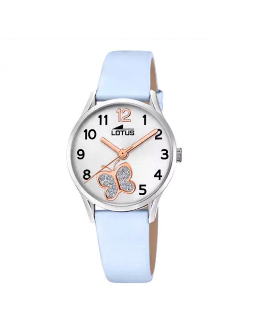 Reloj Lotus para niña 18406/G con mariposa. La esfera es de acero y mide 31 mm de diámetro. La pulsera es de piel con hebilla. Es sumergible a 5ATM por lo que permite el nado en superficie sin inmersión (no aconsejable para la pulsera de piel. Garantía de tres años.