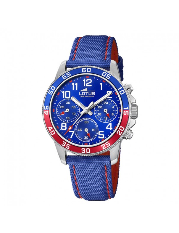 Reloj Lotus para niño 18581/4. La esfera es de acero y mide 36 mm de diámetro. La pulsera es de textil y piel y lleva hebilla. Incluye función cronógrafo. Es sumergible a 5ATM por lo que permite en nado en superficie sin inmersión. Garantía de tres años.