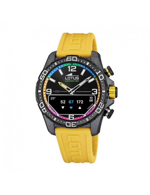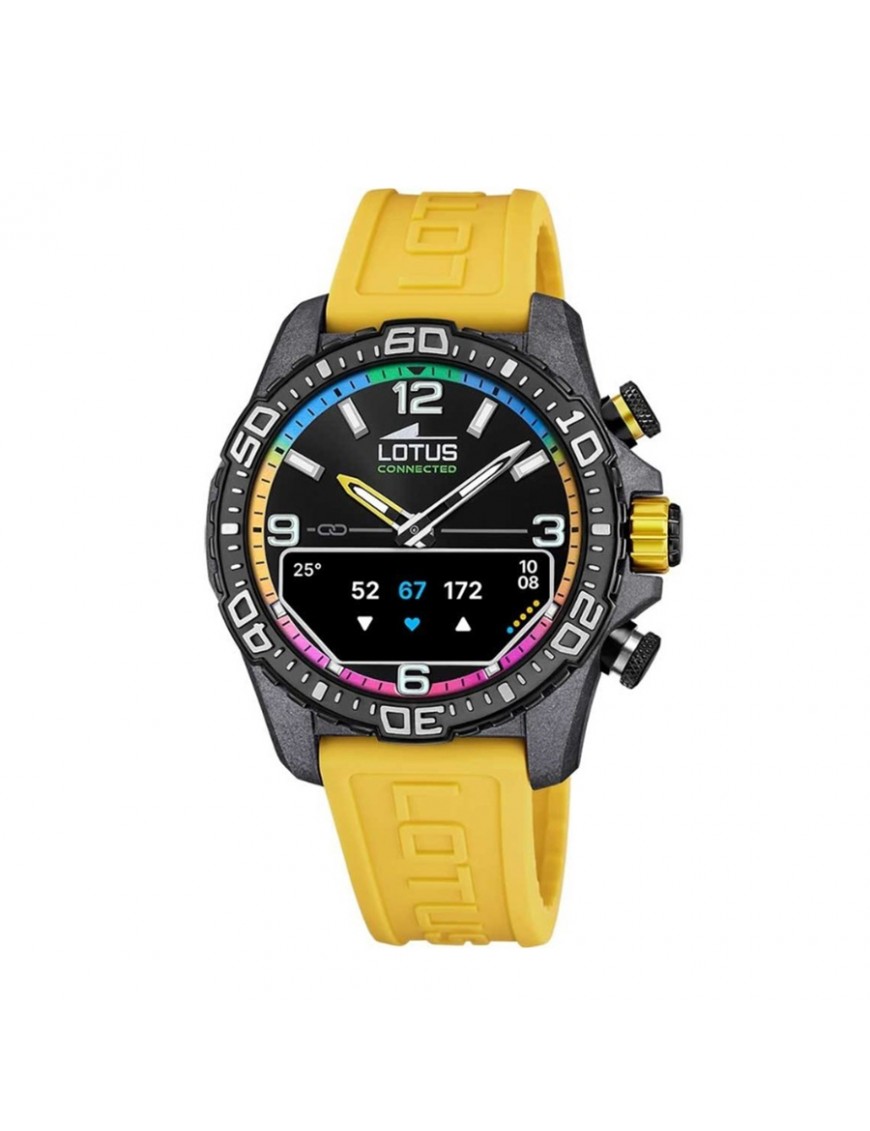 Reloj Lotus Connected D Amarillo 20000/8, analógico y Smartwatch. La caja de este reloj es de fibra de carbono y mide 45mm de diámetro, tiene agujas e indicadores luminiscentes. Pulsera de silicona en color amarilla. Cristal de zafiro resistente a los arañazos.Se conecta con el dispositivo móvil a través de conexión Bluetooth.