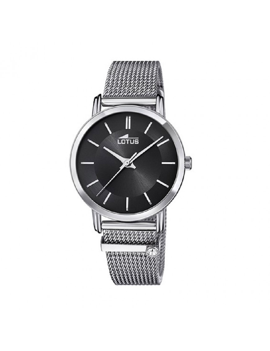 Reloj de Mujer Lotus Trendy con Esfera Negra 18737/4. Caja de acero de 33,3 cm de diámetro con esfera de cristal de color negro. Correa plateada de acero. Sumergible a 5 ATM. Garantía de 3 años.