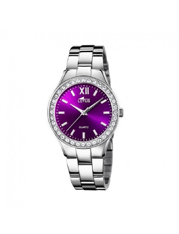 Reloj de Mujer Lotus Bliss con Esfera Morada18883/8. Presenta caja de acero de 32,5 mm de diámetro con circonitas y esfera morada con cristal mineral, la correa de acero lo hacer resistente. Estanqueidad de 5 ATM. Garantía de 3 años.