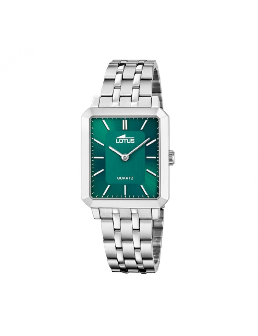Reloj Lotus Square Verde Correa de Acero Inoxidable Mujer 18980/4. Caja rectangular de acero de 28,3mm de diámetro, esfera en color verde con cristal mineral y correa de acero con cierre desplegable. Sumergible a 5 ATM. Garantía de 3 años.