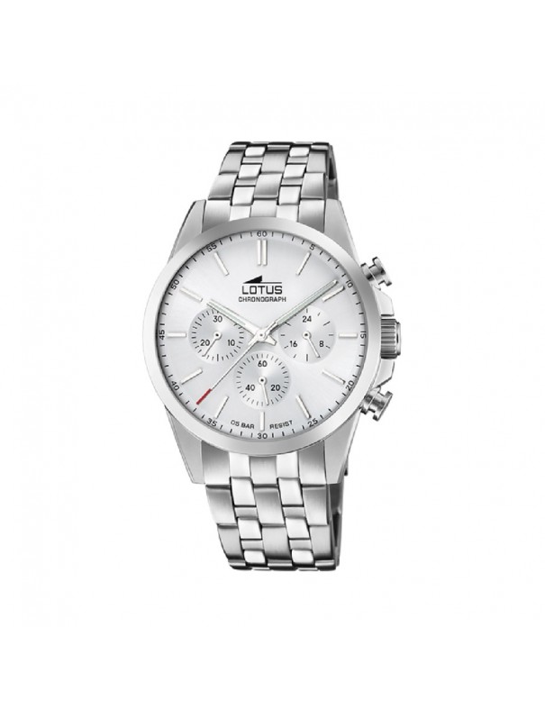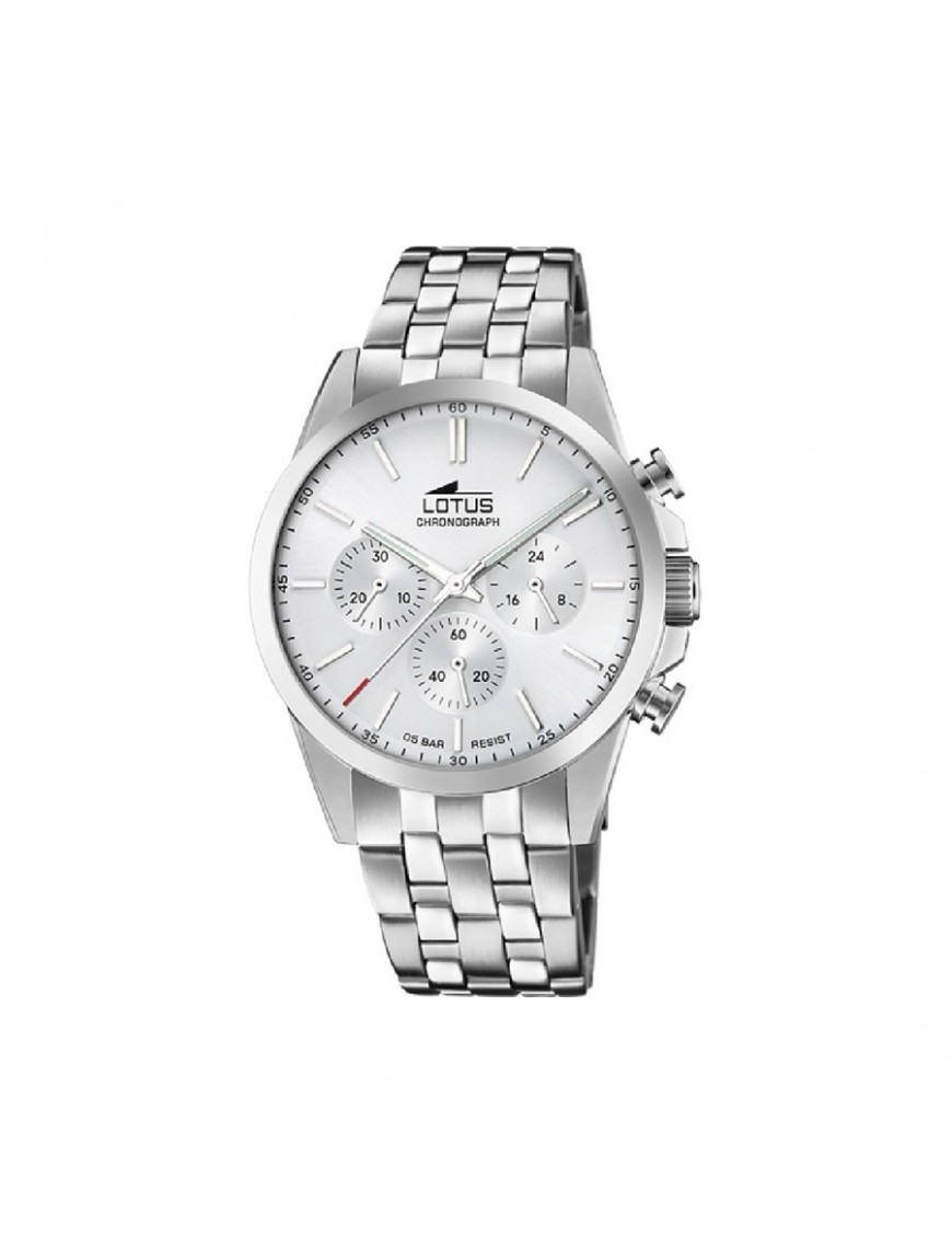 Reloj Lotus Chrono Blanco Correa de Acero Hombre 18989/1. Caja de acero de 41 mm de diámetro con esfera en color blanco, seis agujas y cristal mineral. Correa de acero con cierre de doble pulsador. Estanqueidad de 5 ATM. Garantía de 3 años.