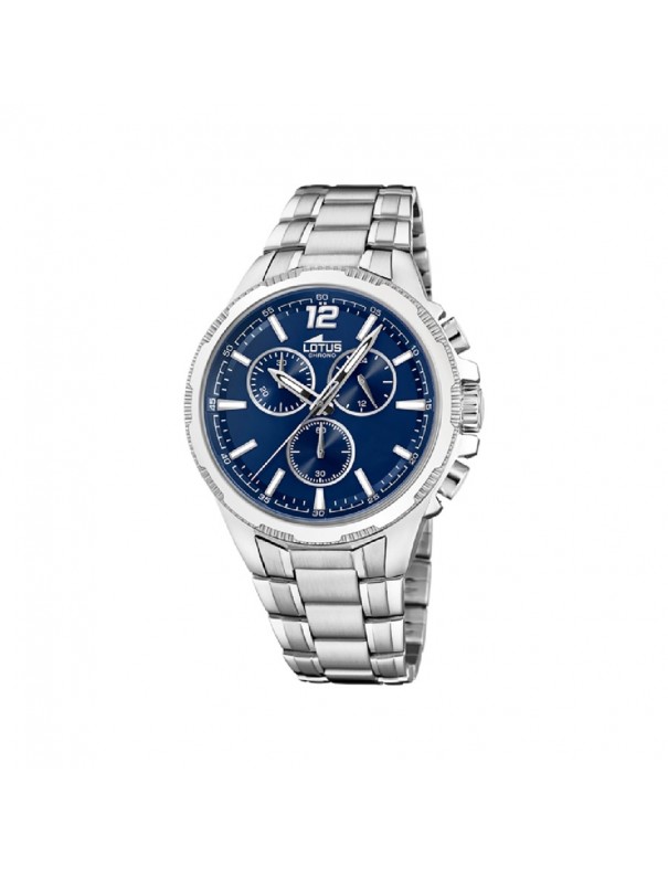 Reloj Lotus Chrono Azul Hombre 18991/2. Caja de acero de 44mm de diámetro con 2 pulsadores. Esfera en color azul que cuenta con 6 agujas y cristal mineral. Correa de acero con cierre de doble pulsador.
