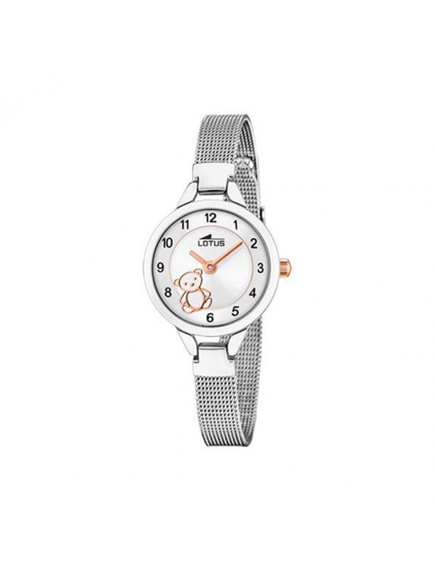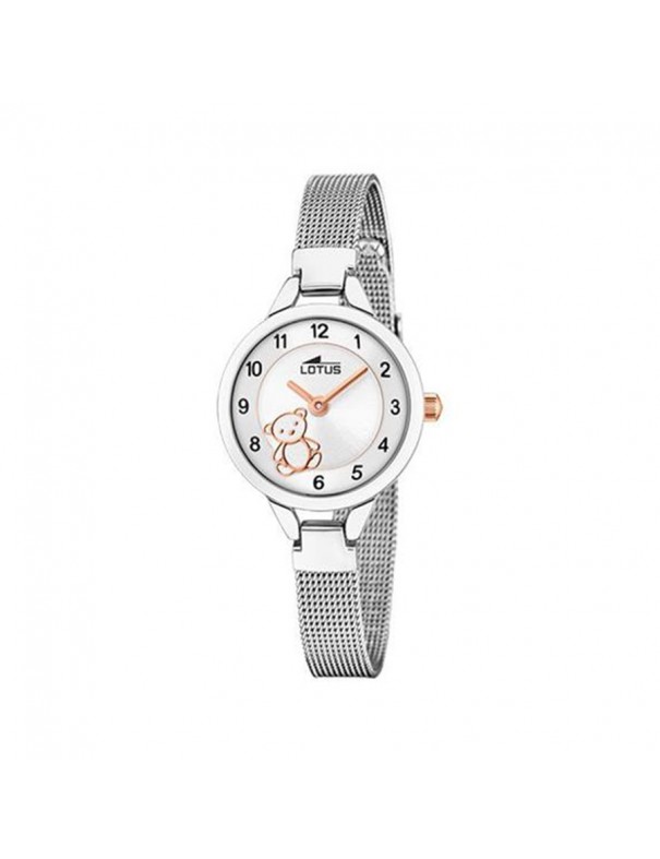Reloj Infantil Lotus Junior con Esfera Plateada 18862/3. Caja de acero de 25 mm de diámetro, esfera blanca con dibujo de un osito recubierto por cristal mineral y correa de acero de cierre de presión. Sumergible a 5 ATM. Garantía de 3 años.