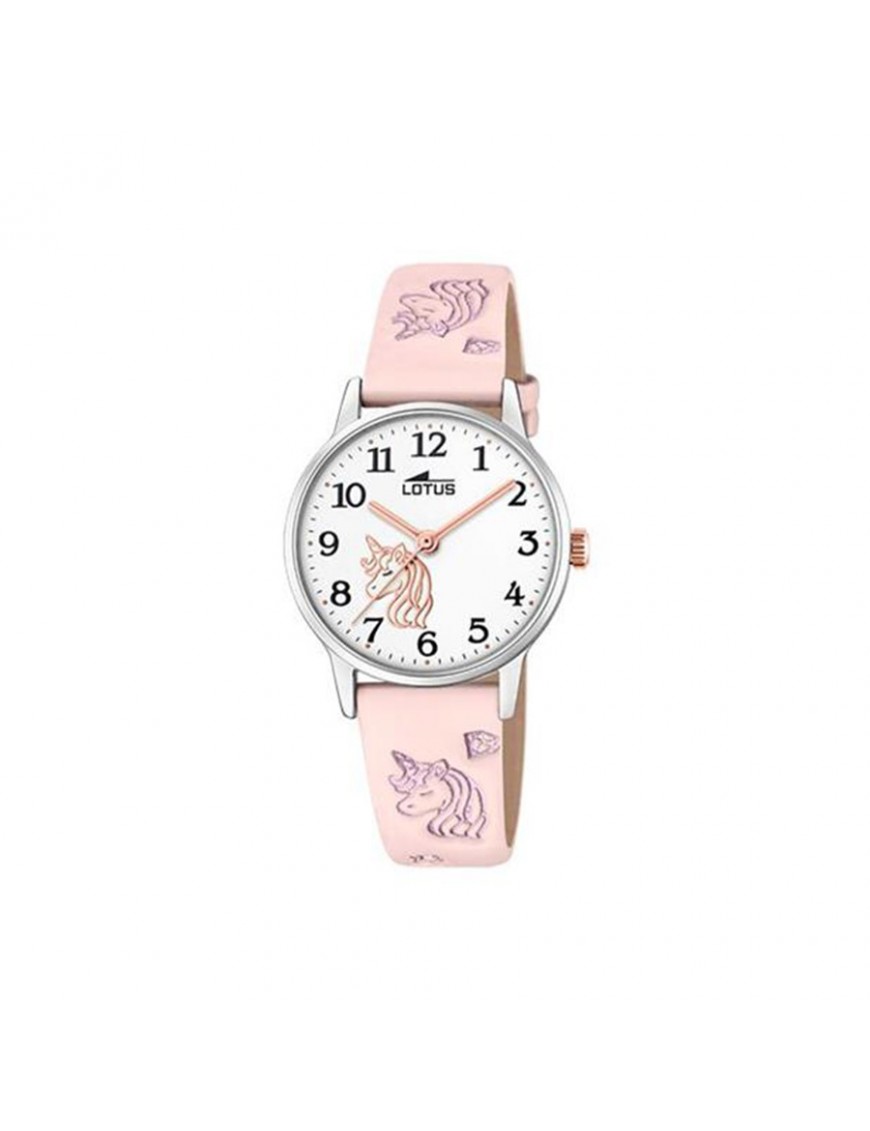 Reloj Infantil Lotus Junior con Esfera Blanca 18865/2. Caja de acero de 30 mm de diámetro, esfera blanca con detalle de unicornio recubierto por cristal mineral y correa de piel rosa con unicornios y cierre de hebilla. Sumergible a 5 ATM. Garantía de 3 años.