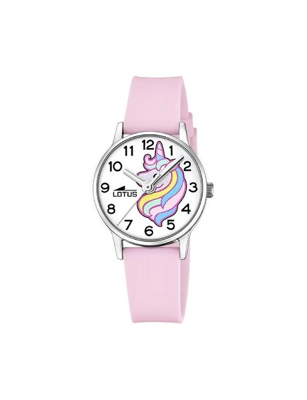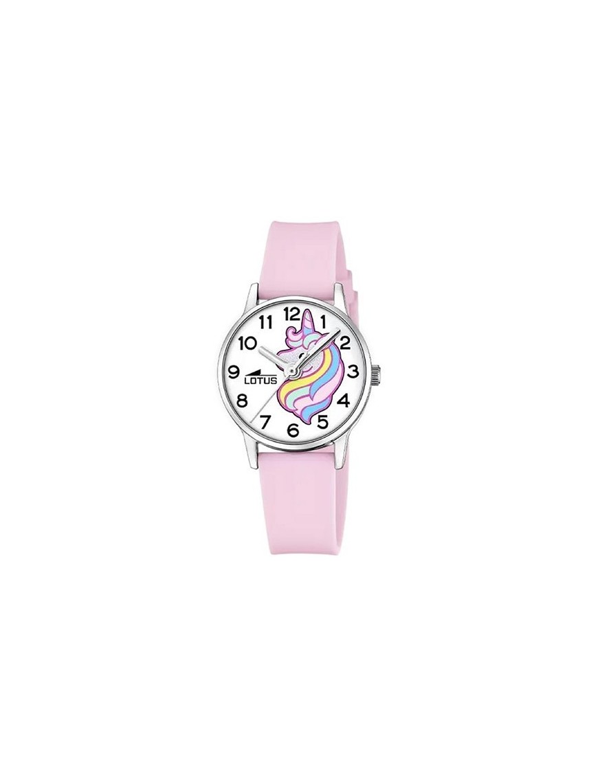 Reloj Lotus Junior Collection Multicorrea de Caucho, Niña 19001/1. Caja de acero de 30 mm de diámetro, esfera con colores combinados con detalle de unicornio recubierto por cristal mineral y correa de caucho rosa y cierre de hebilla. Sumergible a 5 ATM. Garantía de 3 años.