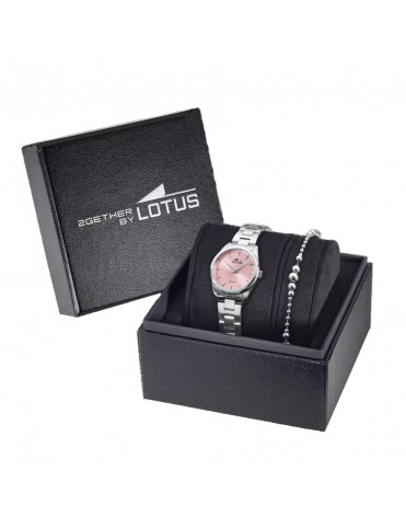 Reloj LOTUS Mujer 2gether con Esfera Rosa Claro 19006/2. Caja de acero inoxidable de 26 mm y esfera rosa, con correa de acero inoxidable plateado y cierre de doble pulsador. Movimiento de cuarzo. Cristal mineral resistente y sumergible hasta 5 ATM. Viene con pulsera de regalo. Garantía de 3 años.