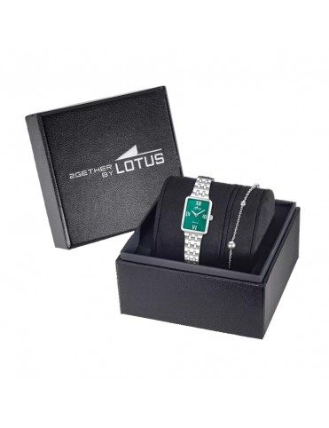 Reloj LOTUS Mujer 2gether Verde 19032/4. Caja rectangular de acero inoxidable y esfera verde, acompañado de correa de acero inoxidable plateado con cierre desplegable. Movimiento de cuarzo, con función de horas y minutos. Cristal mineral resistente y sumergible hasta 5 ATM. Garantía de 3 años.