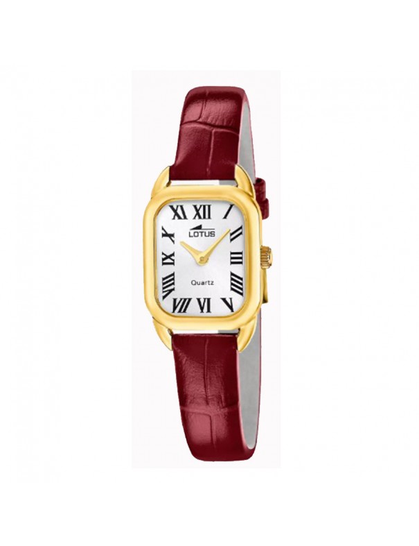 Reloj Lotus 2gether Correa de Piel 19042/1. Cuenta con caja rectangular de acero inoxidable con acabado dorado y esfera plateada protegida por cristal mineral, diseño elegante con estética clásica. Correa de piel burdeos con cierre de hebilla clásico. Funciones de hora con dos agujas y movimiento de cuarzo preciso, ideal para uso diario y ocasiones formales.