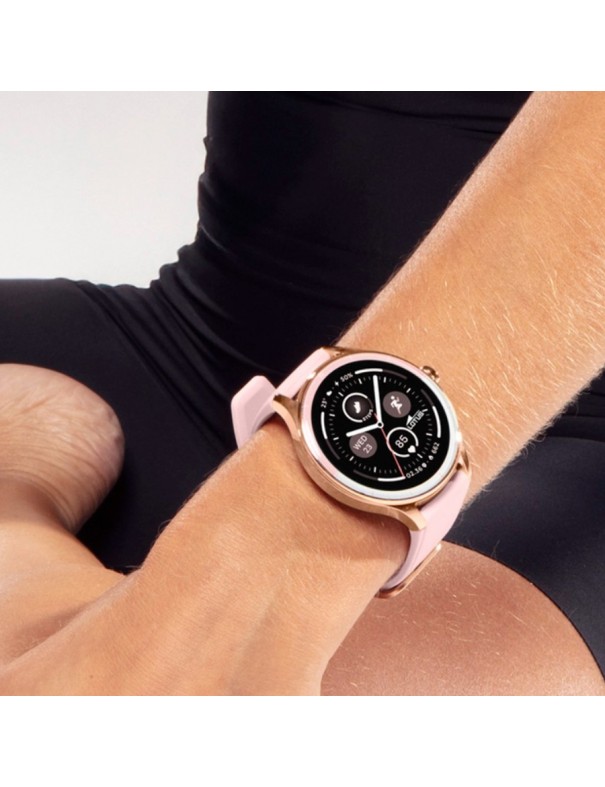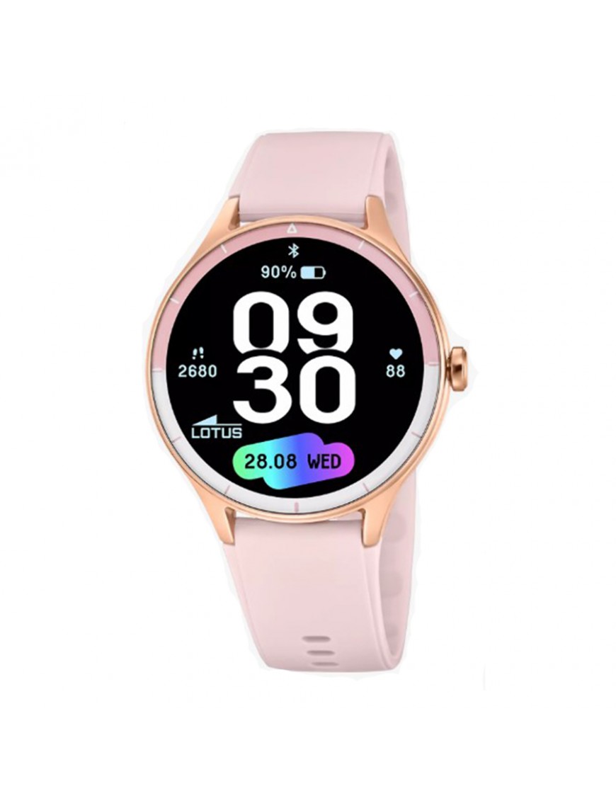 Reloj Lotus Smartwatch 50201/1. Caja redonda y correa de caucho en color rosa con cierre de hebilla cómodo y seguro, pantalla digital con cristal mineral y diseño ligero pensado para uso diario. Funciones inteligentes de seguimiento de actividad, control de bienestar incluyendo monitoreo de estrés, sueño, pasos y notificaciones conectadas por Bluetooth. Movimiento digital smartwatch con conectividad y estilo moderno. Resistente a salpicaduras. Garantía de 3 años.