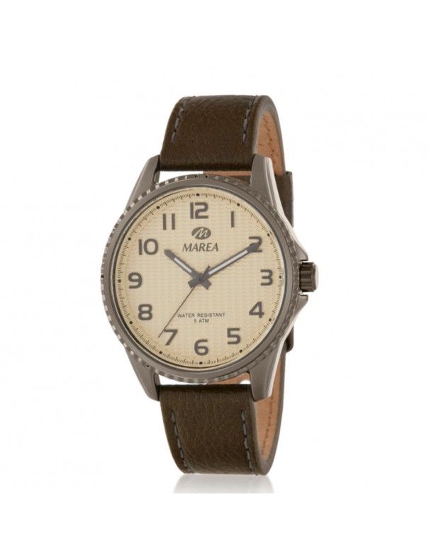 Reloj Marea Hombre B54200/4, caja de 42mm de diámetro y pulsera de piel marrón. Caja de metal, bisel troquelado y agujas luminiscentes. Sumergible a 5ATM, por lo que admite ducha y baño sin inmersión. Garantía de dos años contra defectos de fabricación.