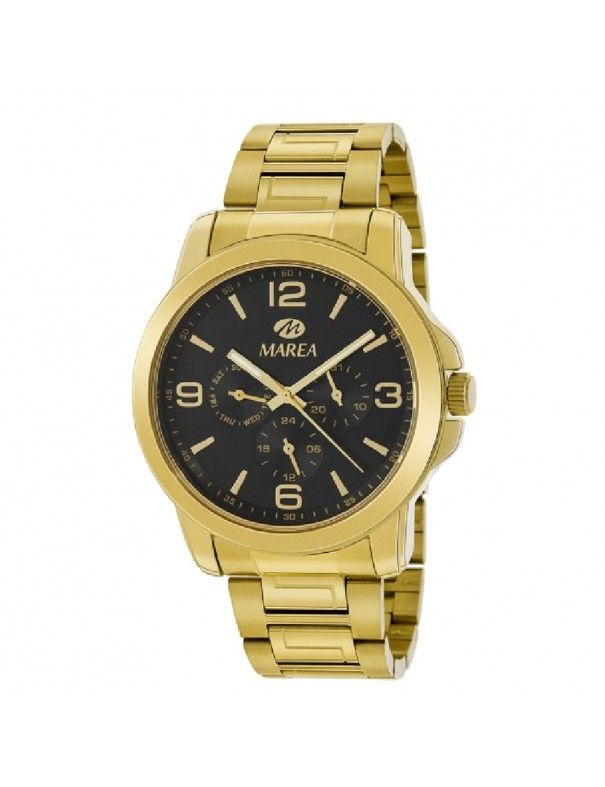 Reloj Marea Hombre B41259/5, analógico multifunción. Caja de acero en color dorado de 45mm de diámetro. Pulsera de acero dorado, cristal mineral. Tres mini esferas: día de la semana, día del mes y formato 24 horas. Sumergible a 5ATM, por lo que es apto para ducha y baño sin inmersión.