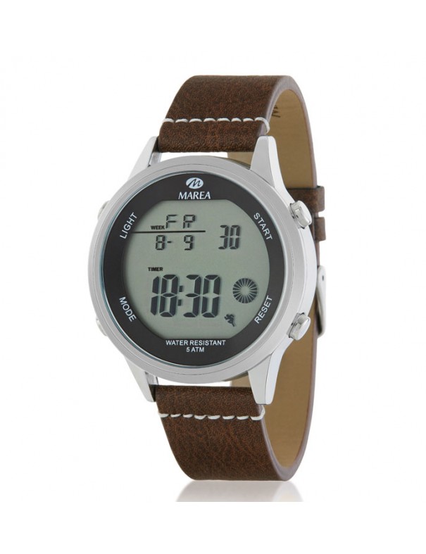 Reloj Marea digital para hombre B35304/9. La esfera es de metal hipoalergénico y mide 45 mm de diámetro. La pulsera es de piel con hebilla. Es sumergible a 5ATM por lo que admite el nado en superficie sin inmersión (no recomendable para la pulsera de piel). Garantía de tres años.