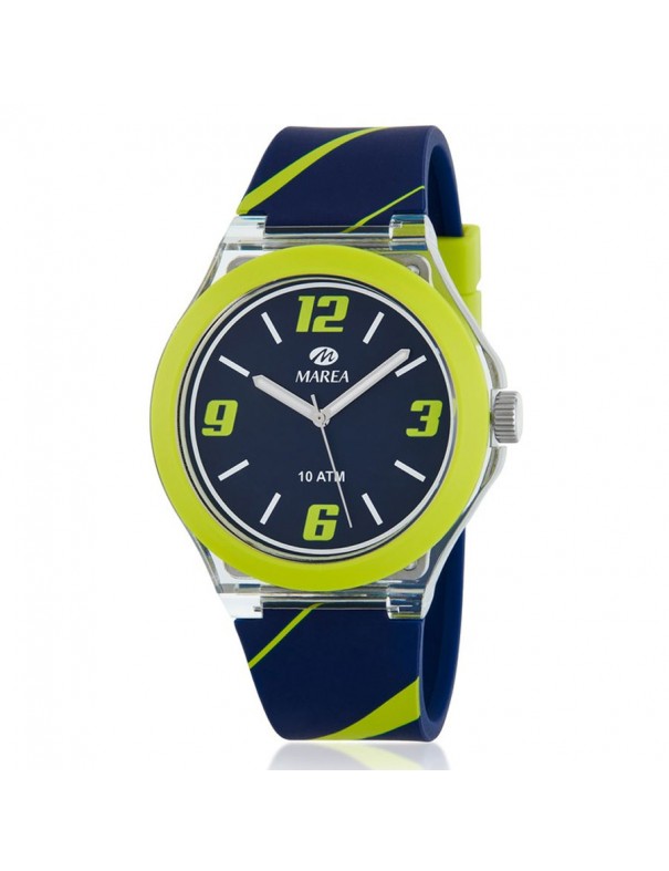 Reloj Marea para hombre B35354/3. La esfera es de plástico y mide 44 mm de diámetro. La pulsera es de silicona con hebilla. Es sumergible a 10 ATM por lo que permite el buceo sin botella. Garantía de tres años.