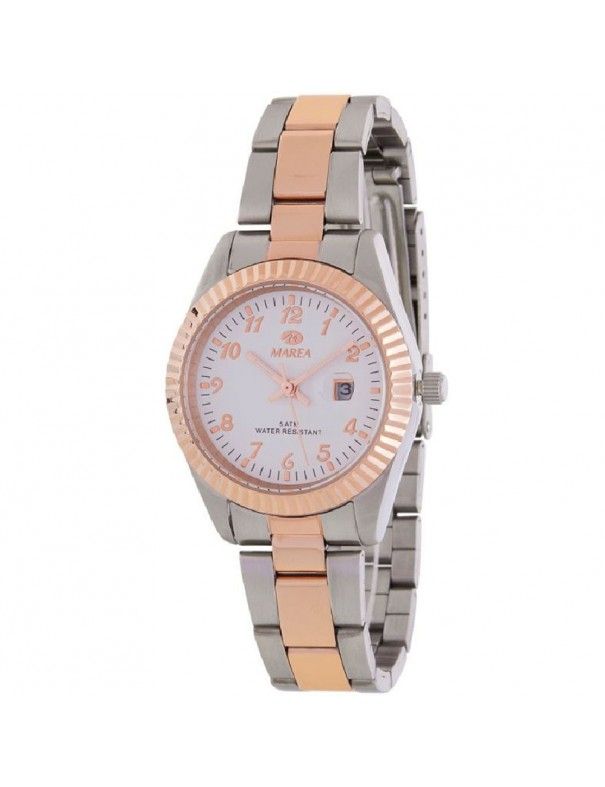 Reloj Marea Mujer B41200/2 Colección Classy. Es un reloj analógico de 3 agujas para mujer elaborado en acero inoxidable bicolor plata con oro rosa. Su esfera es de color blanca sobre la que vemos los marcadores horarios que son números arábigos en color oro rosa como las agujas. Tiene una ventana con indicador de día del mes a las 3 horas. La caja que guarda el mecanismo mide 32 milímetros.