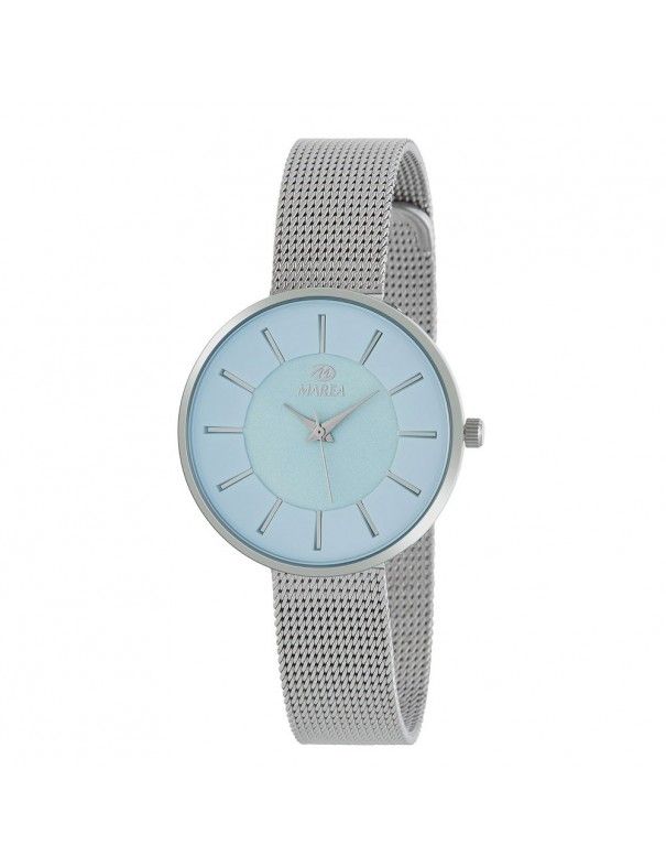 Reloj Marea Mujer Trendy B41245/4. La caja que encierra al mecanismo está hecha en acero inoxidable de color plata y mide de diámetro 34 milímetros y es sumergible a 30 metros de profundidad, 3 ATM. La pulsera en color plateado es de tipo malla milanesa y con cierre en hebilla. Los marcadores horarios son índices en color plata al igual que las agujas.