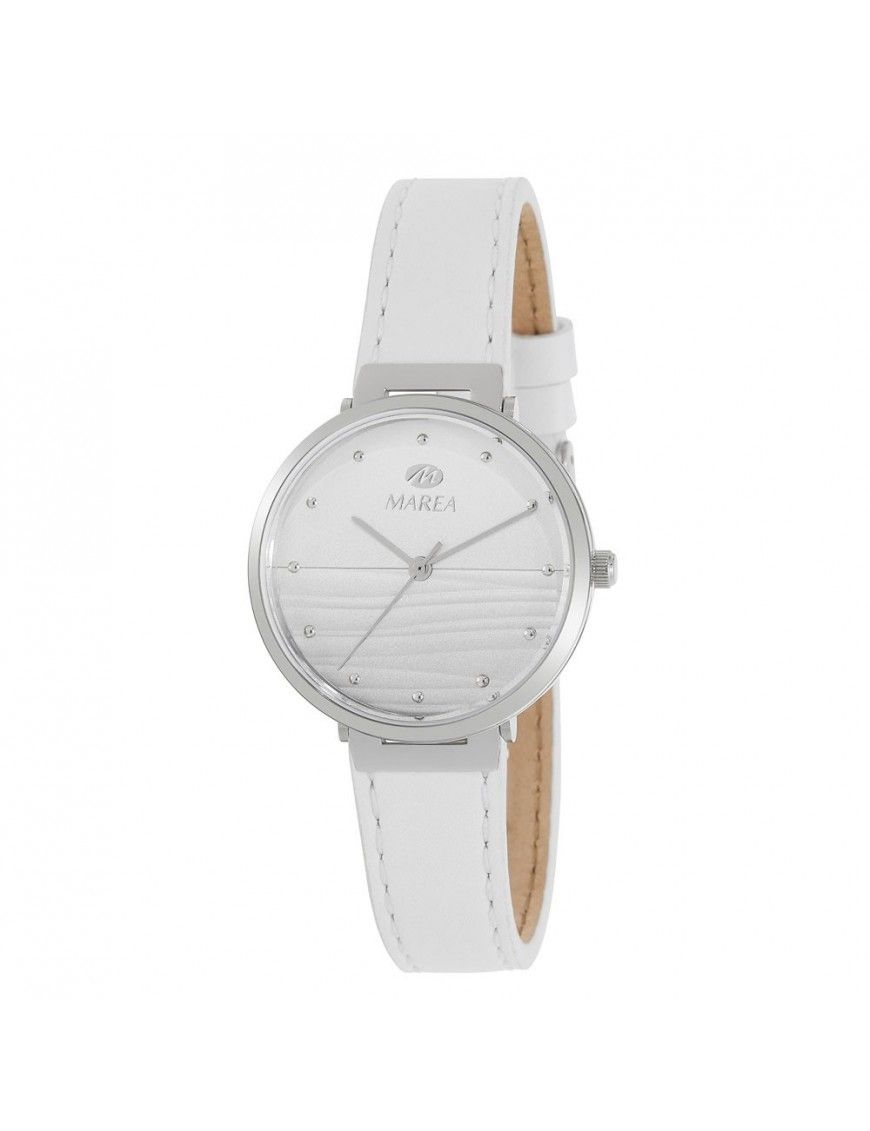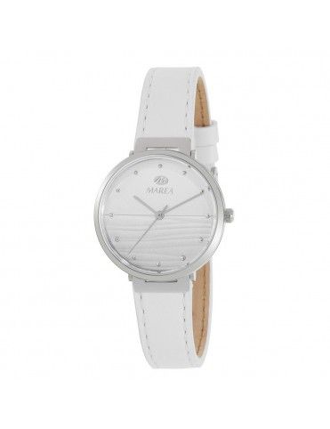 Reloj Marea Mujer B54162/1. La pulsera es de piel de color blanco y con cierre en hebilla. Un cristal plexiglás cuida a la esfera, la cual es de color blanca degradada. Los marcadores horarios son puntitos plateados.