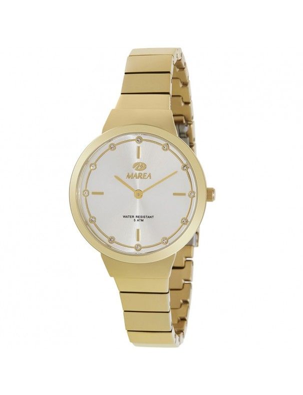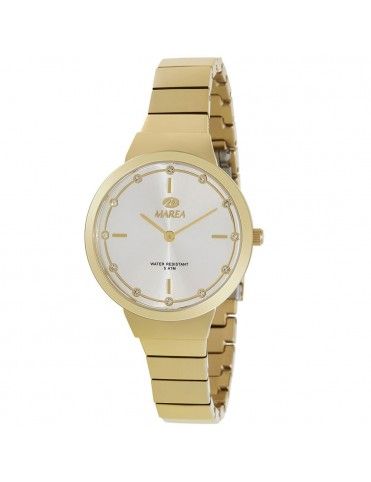 Reloj Marea Mujer Classic B54165/5. Es un reloj analógico de 2 agujas para mujer. La caja y la correa están realizados en acero inoxidable en color oro y mide 34 milímetros. Su esfera con los marcadores horarios en forma de circonitas y las agujas en color dorado. Ofrece una resistencia de 50 metros de profundidad. Somos distribuidores oficiales de los relojes Marea que ofrecen una garantía de 2 años contra defectos de fabricación. Todos nuestros productos se envían con envoltorio regalo y en sus cajas originales.